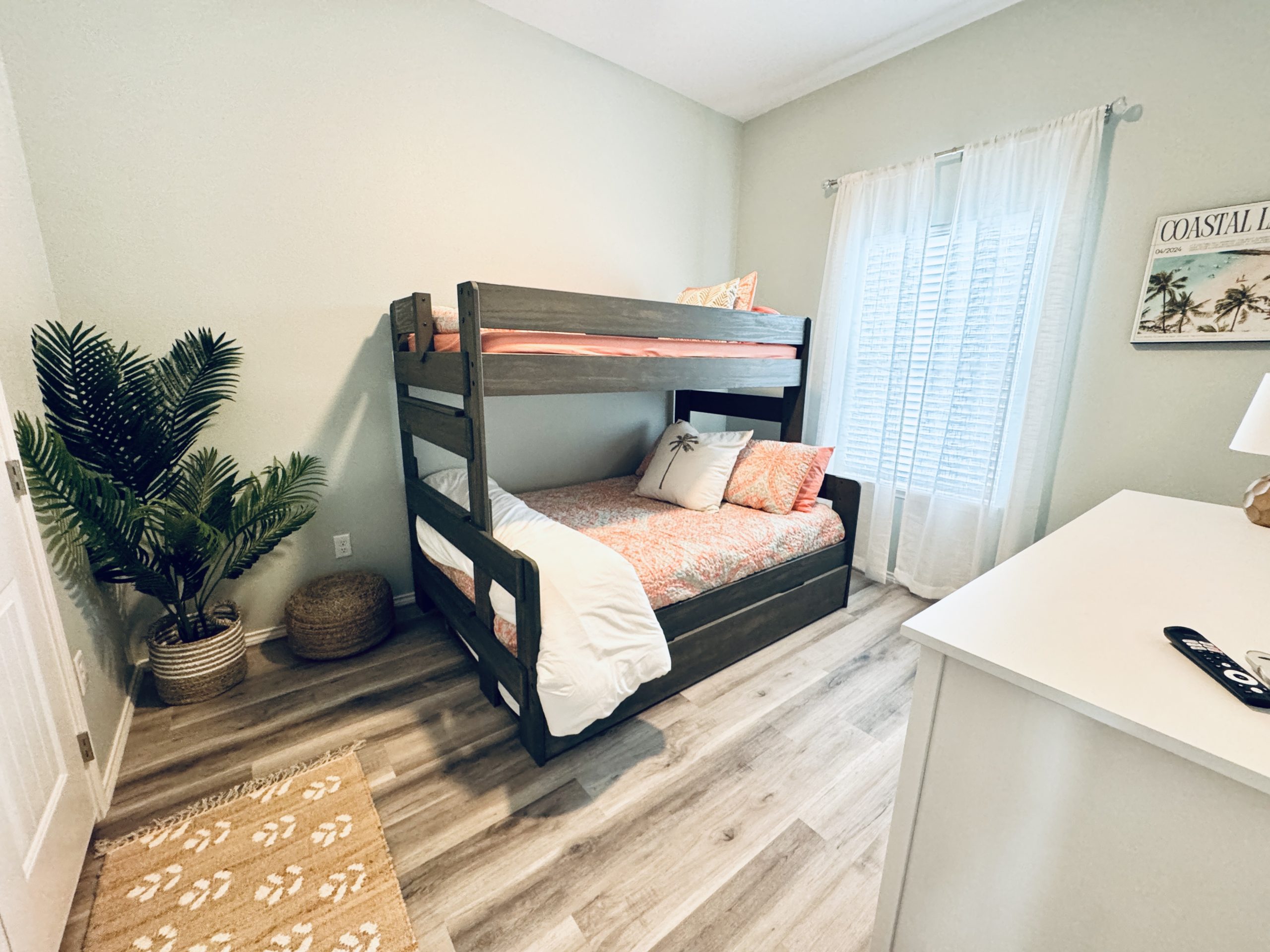 The guest “bunk” room can comfortably sleep 4 as the top bunk is a twin bed, the bottom bunk is a full size bed, and the pull out trundle below the bed is a twin. All beds have comfortable mattresses, multiple pillow options, and additional bed linens are readily available to all guests. You will also find an 8 drawer dresser, hangers for your clothes in the closet, a luggage rack, bedside tables that are moveable, remote controlled ceiling fan, and a mounted smart tv.